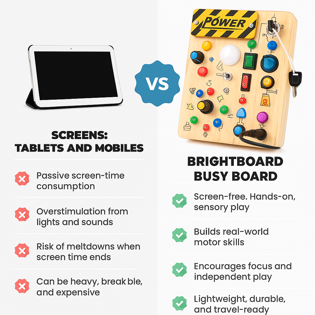 But now there’s a better way. This hands-on board keeps your toddler genuinely engaged without overstimulation — so you can skip the screens and still get a moment to breathe.
